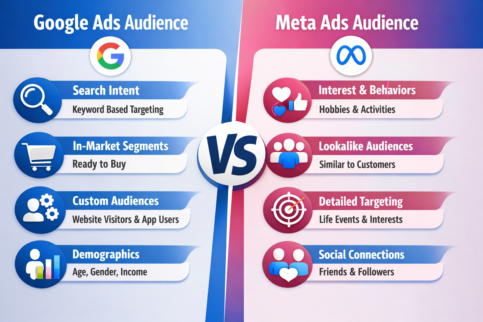 Verdict: Meta excels at audience profiling; Google excels at intent targeting.